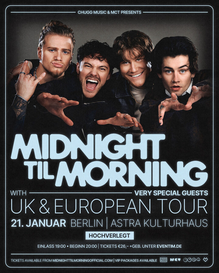 Launched from the global Netflix hit Building the Band, Midnight Til Morning are a breakout four-piece blending powerhouse vocals, emotional vulnerability, and undeniable onstage chemistry. Their debut single “Bye” — co-written with hitmakers behind artists like Benson Boone, Harry Styles, and Shawn Mendes — introduced a soaring, bittersweet sound that’s both cinematic and deeply personal. With a creative team spanning Grammy-nominated producers and acclaimed video directors, every part of their artistry is built to connect. From viral moments to streaming buzz, they’ve quickly captured a global audience drawn to their harmonies, heart, and brotherhood. Now, Midnight Til Morning are stepping off the screen and onto stages worldwide with a live show that promises raw energy, rich storytelling, and unforgettable moments.