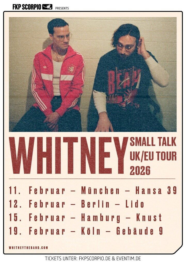 Dieser Gedanke ließ die Band nicht mehr los: Knapp zwei Jahre später hatten sie genug neues Material geschrieben, und beschlossen so, alles selbst in die Hand zu nehmen. Sie nahmen die Songs live auf und produzierten sie eigenständig. Das Ergebnis heißt „Small Talk“, ihr im November erscheinendes, neues Album. Elf intime, ehrliche Stücke, die von neu gewonnener Freiheit und Begeisterung zeugen – und von einer Freundschaft, die in jeder Note spürbar ist. Diese besondere Nähe prägt auch die Live-Auftritte von Whitney, sei es auf großen Festivals wie dem Lollapalooza, Coachella oder Newport Folk Festival – oder bei ihren eigenen Konzerten. Im Februar bringt das Duo seine Songs nach Deutschland: Vier Konzerte mit neuem Album im Gepäck versprechen Abende voller Wärme, Intensität und dem unverwechselbaren Whitney-Feeling.