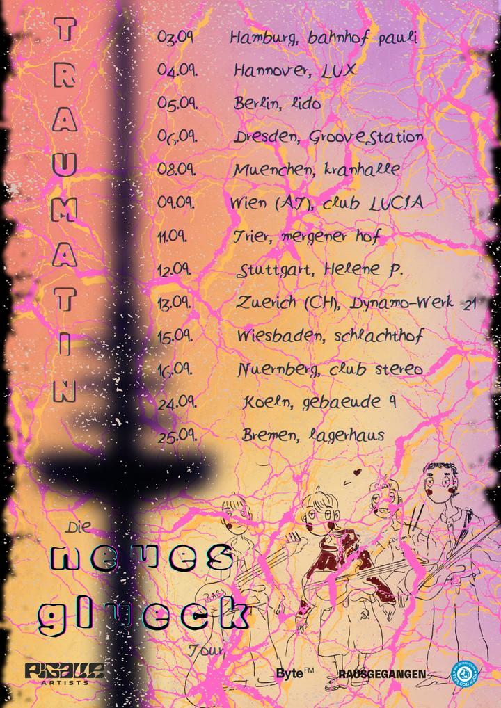 Mit neuem Sound kommt *neues Glück* - und genau so heißt auch die 2025 erscheinende EP von Traumatin sowie die Tour im November und Dezember. Es ist also alles wie immer und alles ist anders. Wir dürfen immer noch mitsingen, wir dürfen immer noch tanzen, wir dürfen auch immer noch traurig sein. Zu unverhohlenen Texten, deren Ehrlichkeit immer noch schmerzt und deren Sarkasmus doch ab und an zwickt. Zu neuen Melodien, eingängig wie gewohnt, verzerrt wie nie. Neues Glück ist die Gefühlswelt, die wir schon kennen und lieben und doch ist hier alles anders. Traumatin ist eine Band geworden - jedenfalls klingt das so. Und Traumatin ist erwachsen geworden - das ist einfach so. Tschüss DAF und hallo alles, was Gitarrenmusik sein kann!